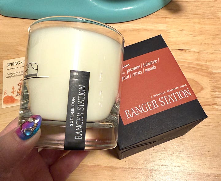Two candles I received recently are in rotation at my house. I’m loving the big white florals in Superbloom from Ranger Station. I’m a big fan of their candles. They burn evenly and have nice hot and cold throws.