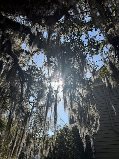 I just got back from a work trip to Charleston, South Carolina, which is a very lovely, if not complicated, place. The smells were good. The first day I smelled an ashy burning in the air and wondered if that was a Charleston thing, but a tour guide told me it was likely from a wildfire a few miles away. Things were just starting to bloom, so I got to see a little bit of their state flower, yellow jessamine (which our tour guide pronounced like jasmine), just starting to show its face. It had a very faint smell but apparently is much stronger at peak season, when it’s exploding everywhere. The gardens were orderly and manicured and very British. Azalea bushes were everywhere in pinks and reds. The Spanish moss made things feel mystical and very Southern. The trees were giants, full of history.