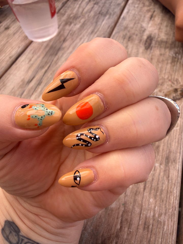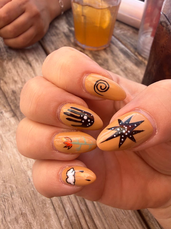 I’ll be sad to see this nail set go. Now to decide what my birthday nails will be. I’m hoping the dress I land on provides some direction. This set was inspired by the artwork of Kelsey Wickwire. I love finding an artist to inspire my nail sets. It’s fun to see what Kim, my nail tech, does with it.